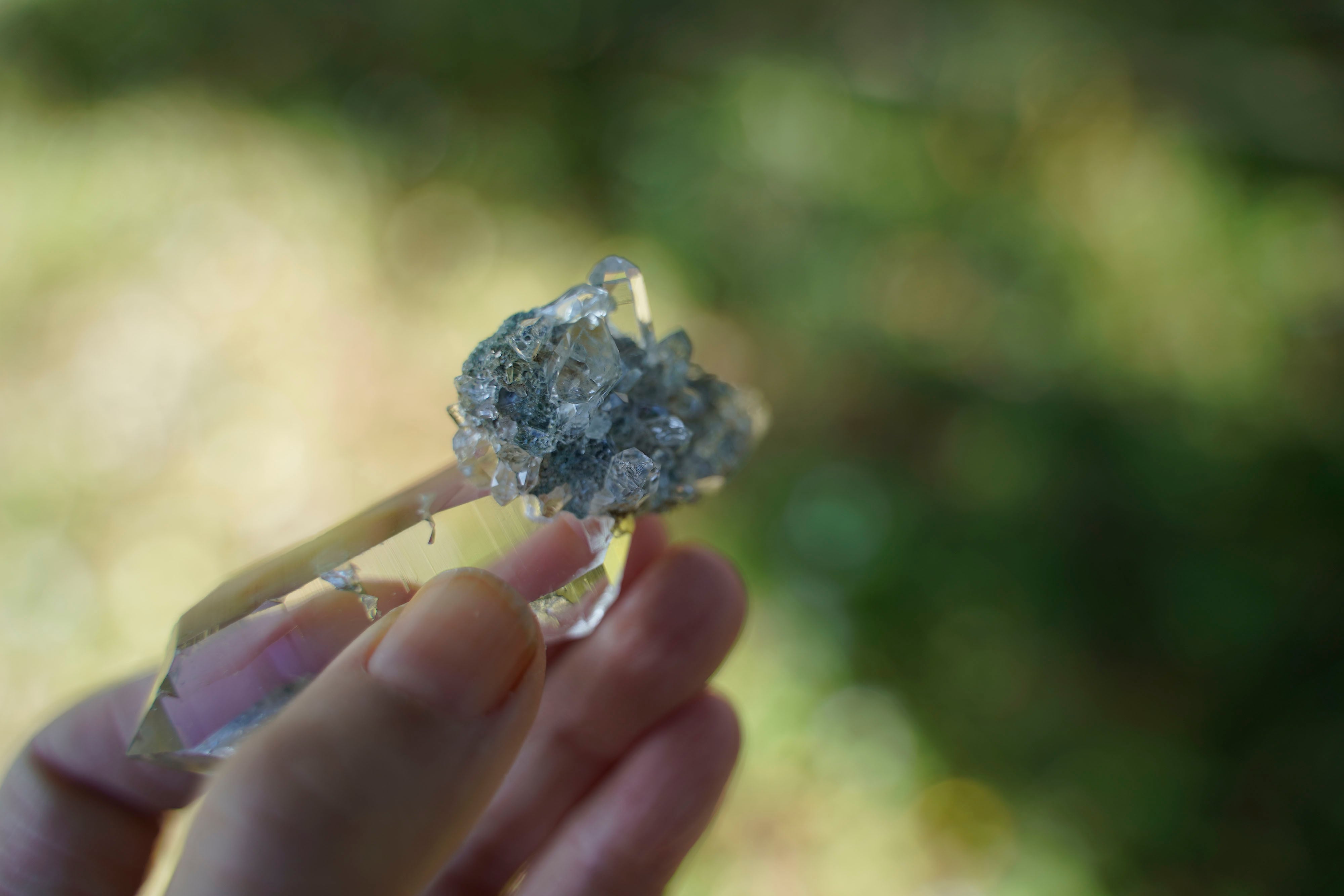 小さな結晶が集まったクラスターの部分もひとつひとつ美しい透明度があり、底面には緑泥石(クローライト)が付着しています。